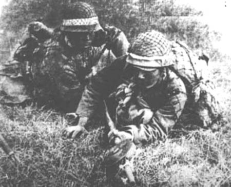 drillmäßiger Angriff auf gegnerische Panzer mit aus Bambusstock und Panzermine gefertigter Stockmine